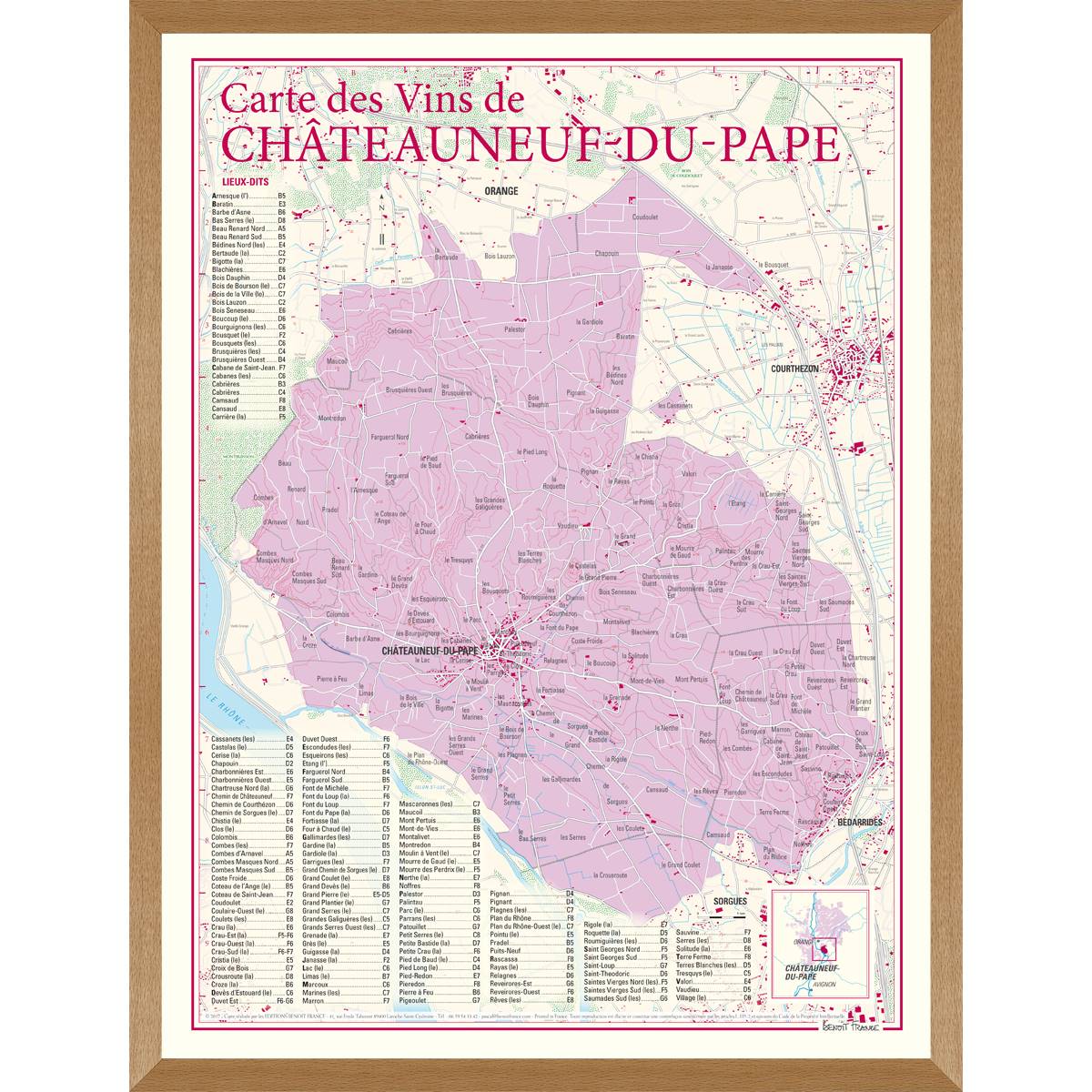 Ce document cartographique présente de façon extrêmement détaillée (18 millimètres pour 1 kilomètre) le prestigieux vignoble de Châteauneuf-du-Pape. Sont mentionnées et représentées les 5 communes qui composent l’appellation et la totalité des lieux-dits cadastraux que l’on retrouve le plus souvent sur les étiquettes des bouteilles. Une liste alphabétique de ces lieux-dits permet au moyen d’un carroyage de les situer rapidement sur la carte. carterine de situation.